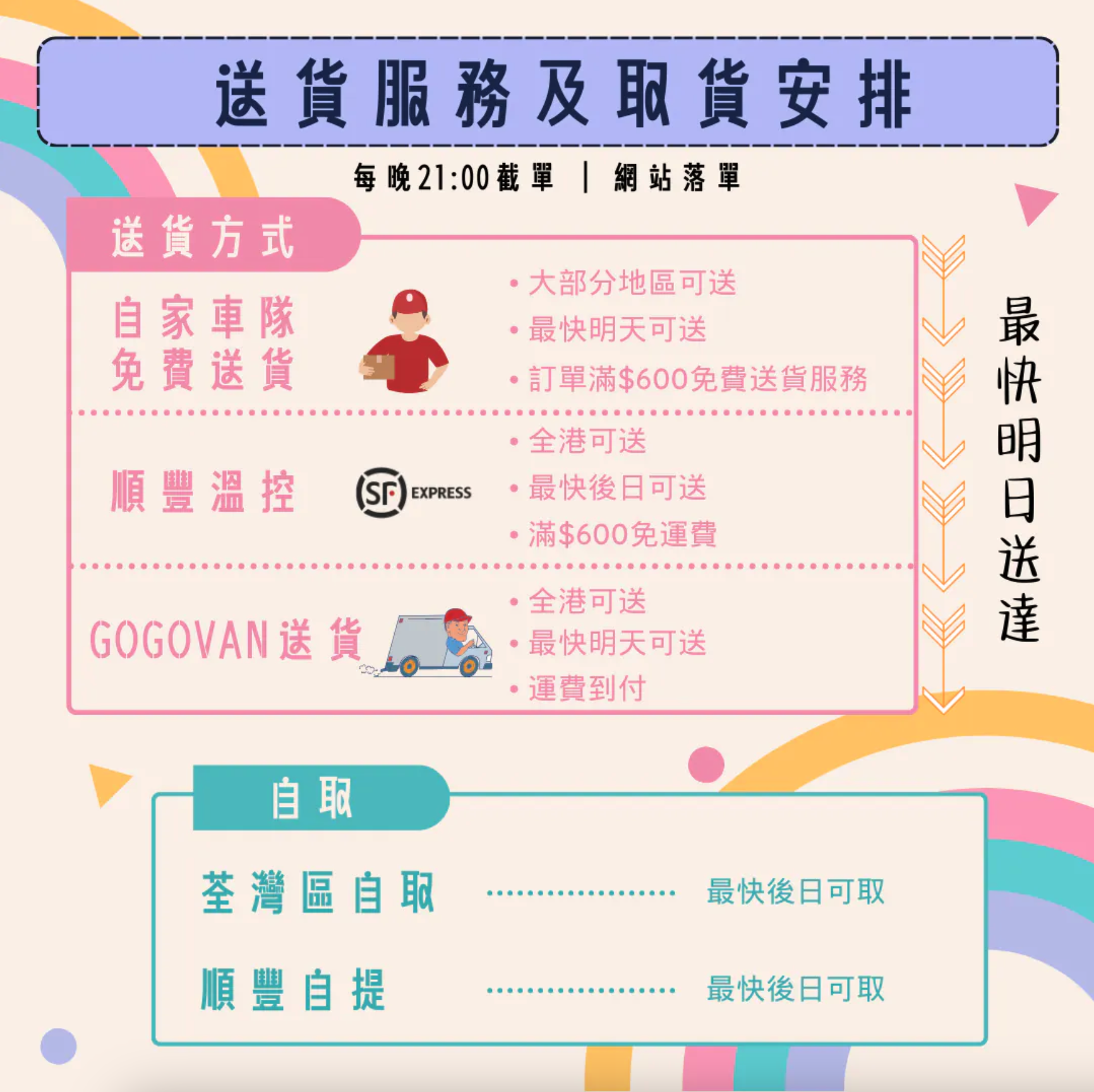 For purchases under HKD $600, delivery service will be provided by GOGOVAN, and shipping fees are self-paid.