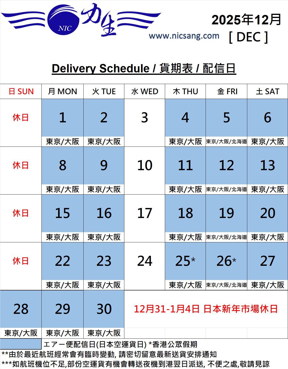 (紅色日子代表日本市埸假期,當日沒有空運產品,因此本地送貨服務也會暫停。不便之處,敬請原諒!)